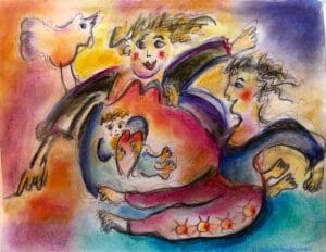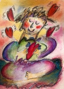 Merci Denise pour cette pratique si libératrice. En partant avec un tel titre je me suis dis que ça ne peut pas faire autrement que nous faire du bien. J’ai eu l’occasion de la mettre en pratique aujourd’hui alors que je vivais des tensions intérieures à me mettre de la pression de performance envers mon entourage… ta pratique m’a permis de prendre l’appel en dedans et grâce au trio j’ai retrouvé une belle joie et de la douceur envers mon petit moi qui se voit plus grand que nature parfois. Aussi ta pratique est joyeuse et vivante avec tes toiles colorées et d’ailleurs la 4e a particulièrement attiré mon attention dans laquelle je vois un personnage joyeux qui me semble prendre soin de son petit moi a l’intérieur tout en étant entouré d’amour avec l’autre personnage… son bonheur et son amour est évident, il attire même un oiseau