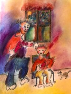 « je vois un personnage joyeux qui me semble prendre soin de son petit moi a l’intérieur tout en étant entouré d’amour avec l’autre personnage »